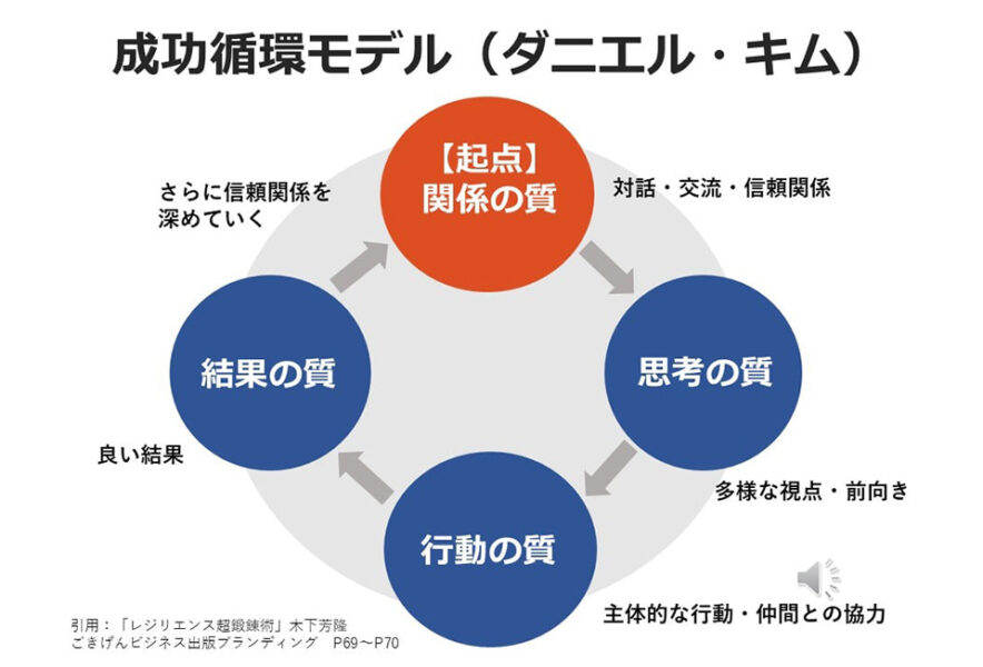 チームを良くしたいと考えたとき、多くの人は「結果」や「行動」を変えようとしがちです。しかしダニエル・キムの成功循環モデルが示すように、成果を生み出す源泉は、実はもっと手前にある「関係の質」にあります。職員同士が信頼し合い、安心して意見を交わせる関係があれば、自然と良い思考が生まれ、前向きな行動がとれるようになり、結果としてチームの成果もついてきます。