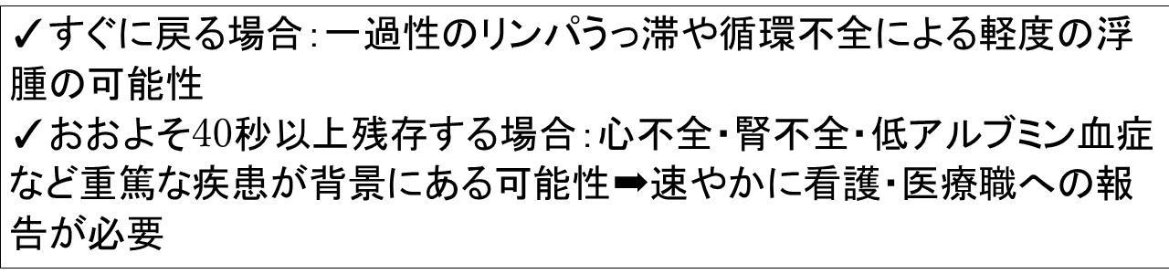 - 触れる中で皮膚の温度・乾燥・浮腫を触察し、体調変化を早期発見。