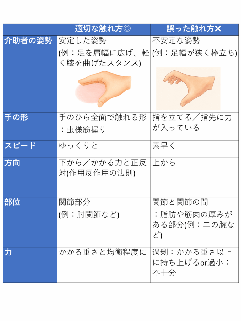 介助する際、その触れ方によって、利用者の自立度を大きく左右します。適切な触れ方は「できる力」を引き出すことができます。一方、誤った触れ方は、「できる力」を奪ってしまいます。以下に適切に触れるためのポイントと、よく見かける誤った触れ方についてまとめました。