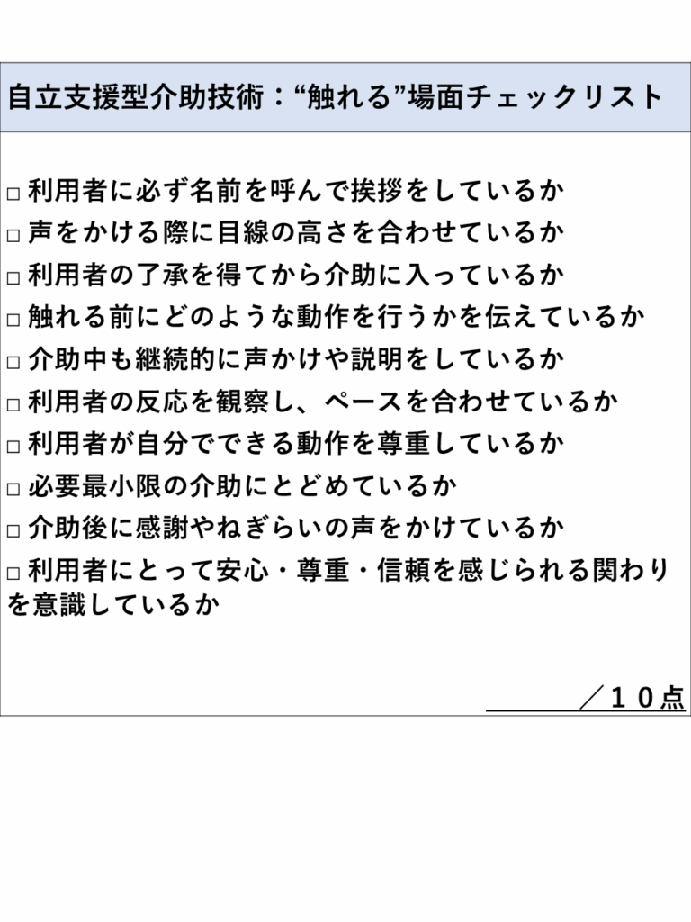- 触れる前に声かけ・説明・同意を得ることで安心と尊重を提供。