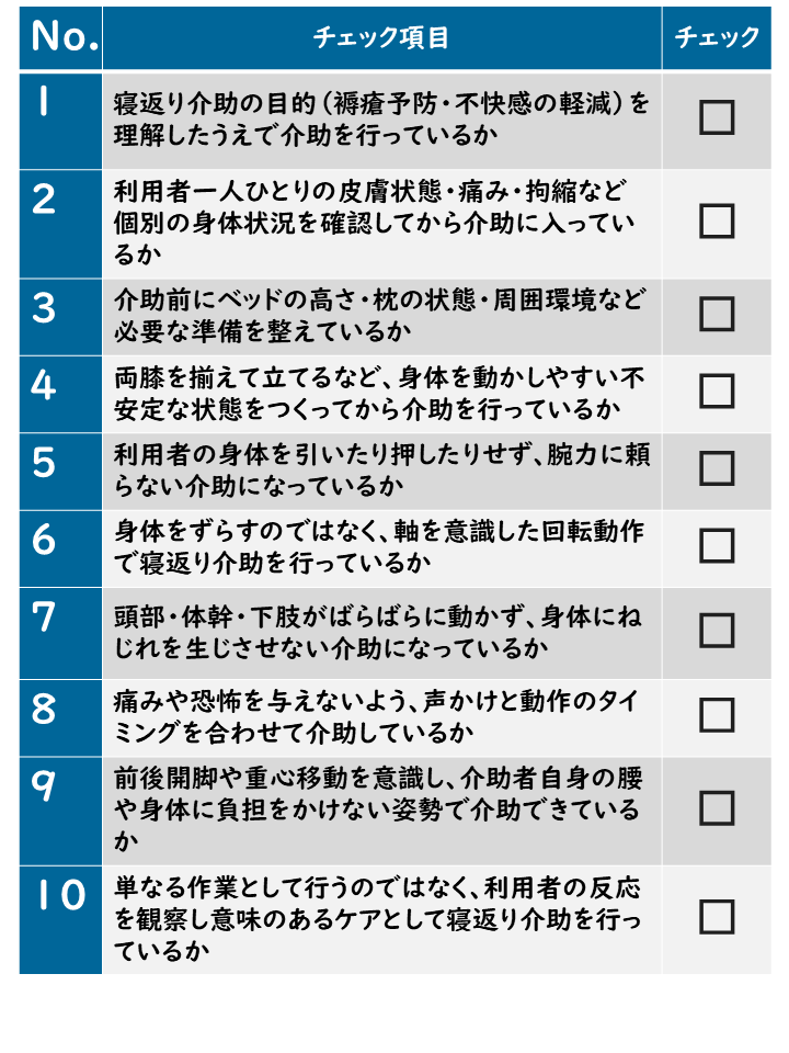 利用者さんの力を引き出せる自立支援型寝返り介助を浸透させていくためには、あなたの力が必要です!チェックポイントをぜひ自身の介助方法の見つめ直しや、指導等にぜひご活用ください。