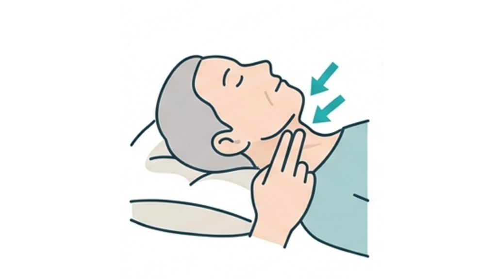 枕が低すぎたり、へたっていたりすると、寝ている方のあごが上がってしまいます。あごが上がった状態は、首や背中に不要な緊張を生み出し、身体全体がこわばって寝返りが非常にしづらくなります。喉仏と顎の先に指が2本入る程度の高さが目安です。ぜひ、あごが上がった仰向けからの寝返りと、枕を目安となる望ましい高さに調整した状態で寝返りしてみてください。寝返りの介助の“前段階”として、“顎を引いた姿勢”にまず整えることがいかに重要か、体感できることと思います。