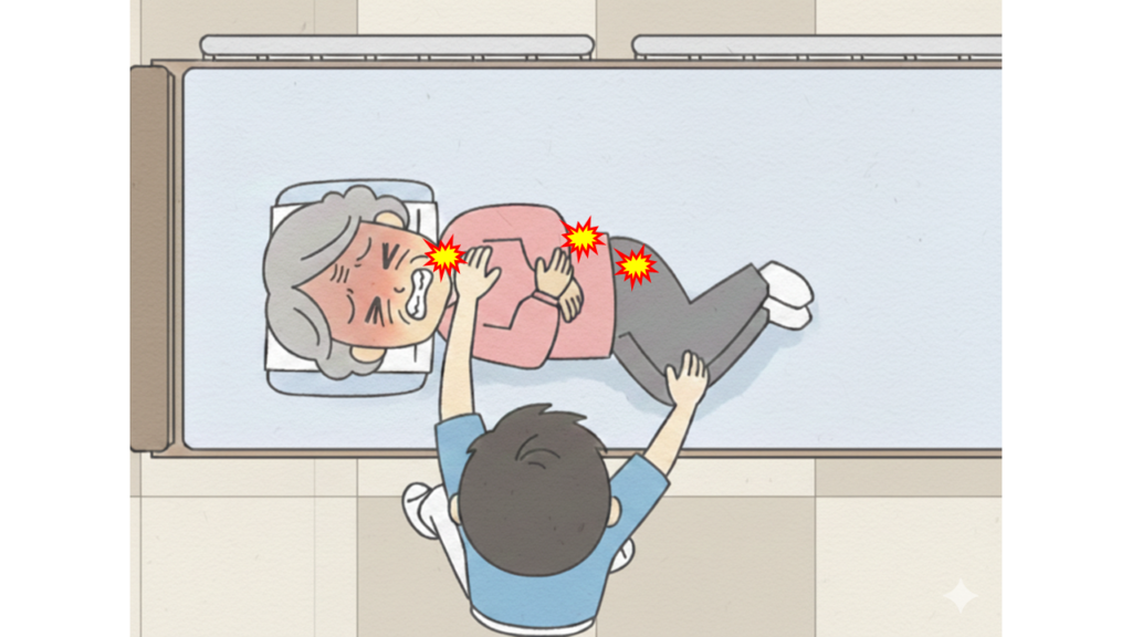 単に向きを変えるだけの介助として寝返りを終わらせようとすると、頭部と上半身、上半身と下半身がバラバラに動いてしまい、身体が「ねじれ」てしまうことがあります。これは、寝返り介助における最も一般的で危険な間違いです。