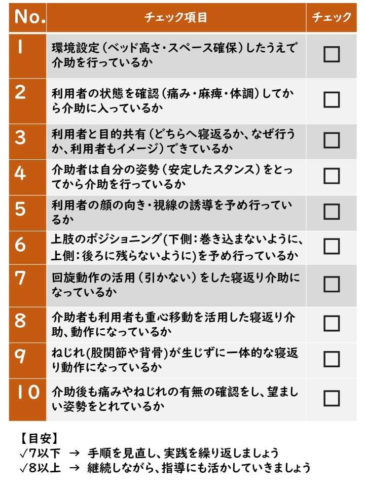 利用者さんの力を引き出せる“自立支援型寝返り介助”を浸透させていくためには、あなたの力が必要です!チェックポイントをぜひ自身の介助方法の見つめ直しや、指導等にぜひご活用ください。