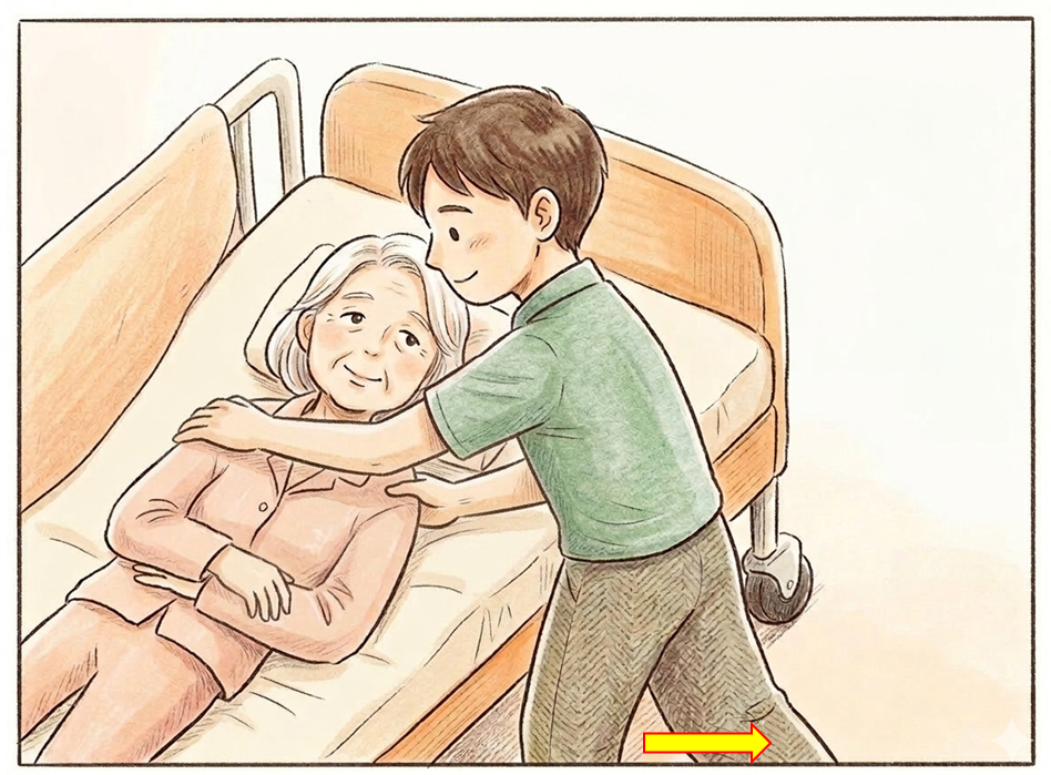 ✓ 介助者のスタンス: 足を肩幅程度に、進行方向に対して前後に開いて立ちます。重心を低く安定させ、腕の力だけでなく、体幹と体重移動で動かせる準備体勢へ整えます。