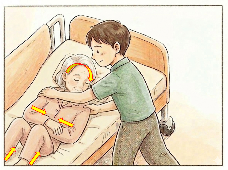 ✓ねじれの防止: 頭部、上半身、下半身をバラバラに動かすのではなく、同時に同じ方向へゆっくりと倒します。これにより、頚部や脊柱への無理な負担(ねじれ)を防ぎ、骨折や緊張の悪化を回避します。一方、このねじれが身体へのストレスやリスクにならず、かえって寝返り動作を有効的に引き出すケースもあります。痛みや筋緊張の悪化のリスクがなく、かつ自身で手を伸ばしたり膝を立てる、横に倒していくなど、一定量自力でできる利用者は、ねじれを活かせるよう促し、どちらの方法が有用か確認していくことも大切です。