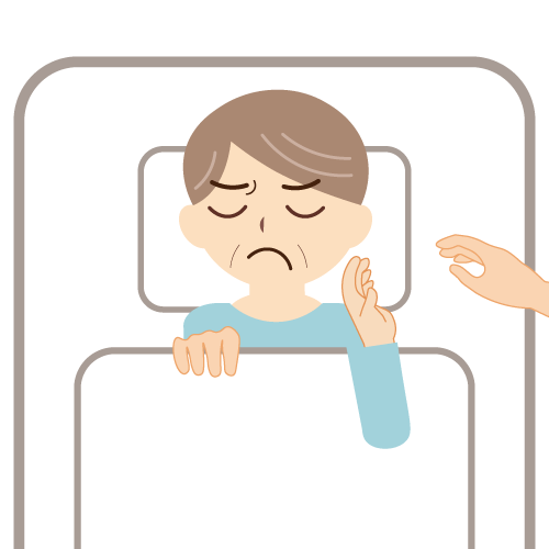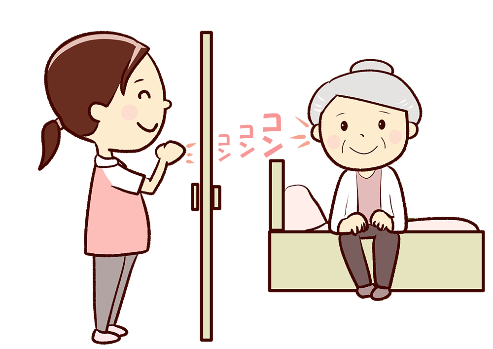 プライバシーに配慮し、必要以上に近づかないことが関係性を築く上で基本です。おおよそ腕一本分(約60〜70cm)の距離を保ち、“触れる直前まで”はこの距離を保ち、会話をしたり介助の流れの説明をしましょう。また、それ以前に居室に入る際やカーテンを開ける際には、「ノック→あいさつ→目的」の順で伝えます。この時、こちらを認知しているのがノックの段階か、あるいはあいさつの直前なのかなど、適宜評価しながら行うよう心掛けましょう。