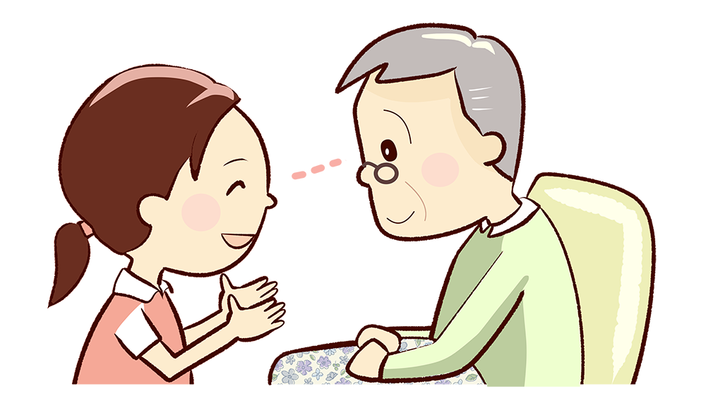 立ったまま見下ろす形で話しかけられると、多くの方は威圧感を覚えます。それは、介助の受け入れの可否に直結していきます。座っている方には膝を曲げて腰を落とし、同じ目線で話すようにしましょう。その姿勢を取ったうえで、一呼吸置いてから話し始めると、利用者が「自分のペースで応じられる」と感じやすくなります。