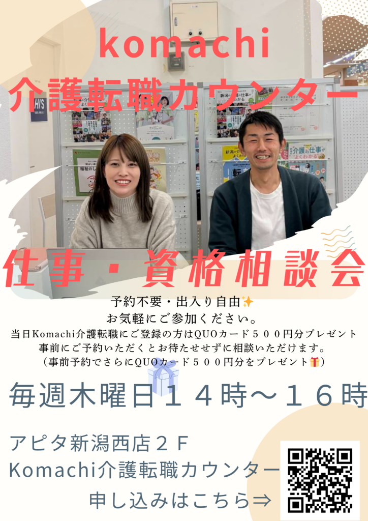 内容:Komachi介護転職カウンターで板垣・石井が介護のお仕事相談や資格取得の相談ができます!さらにKomachi介護転職に事前もしくは当日登録の上、予約してご来店・ご相談いただいた方にはクオカード500円分をプレゼント!!お得な機会に多くの方のご来店をお待ちしています!