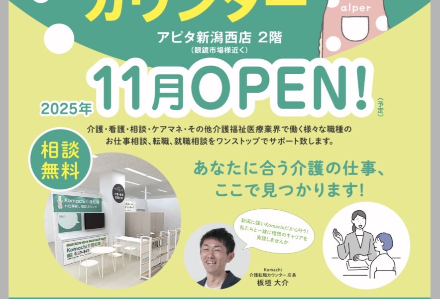 このたび、アピタ新潟西店にて「Komachi介護転職カウンター」がオープンします!